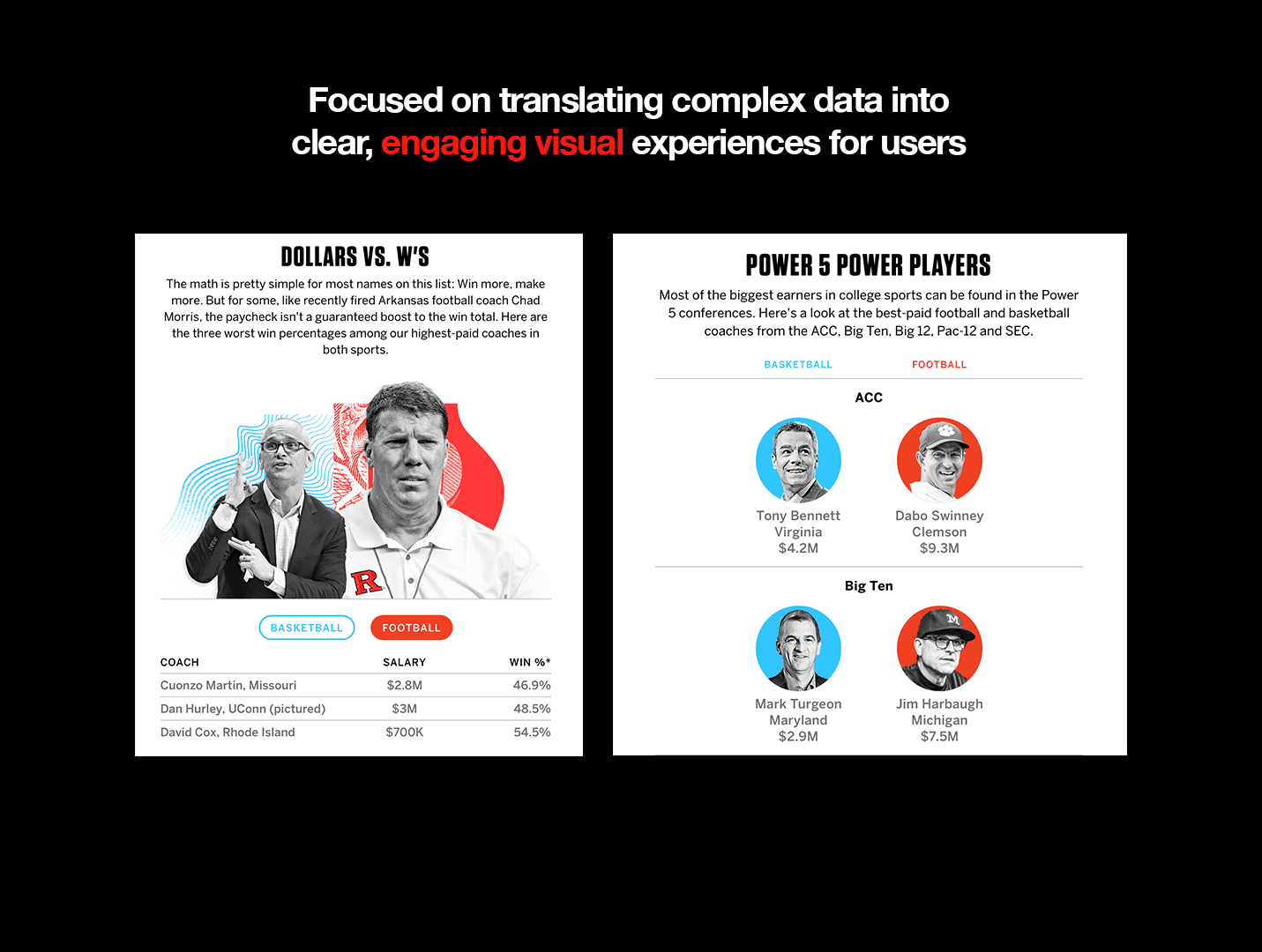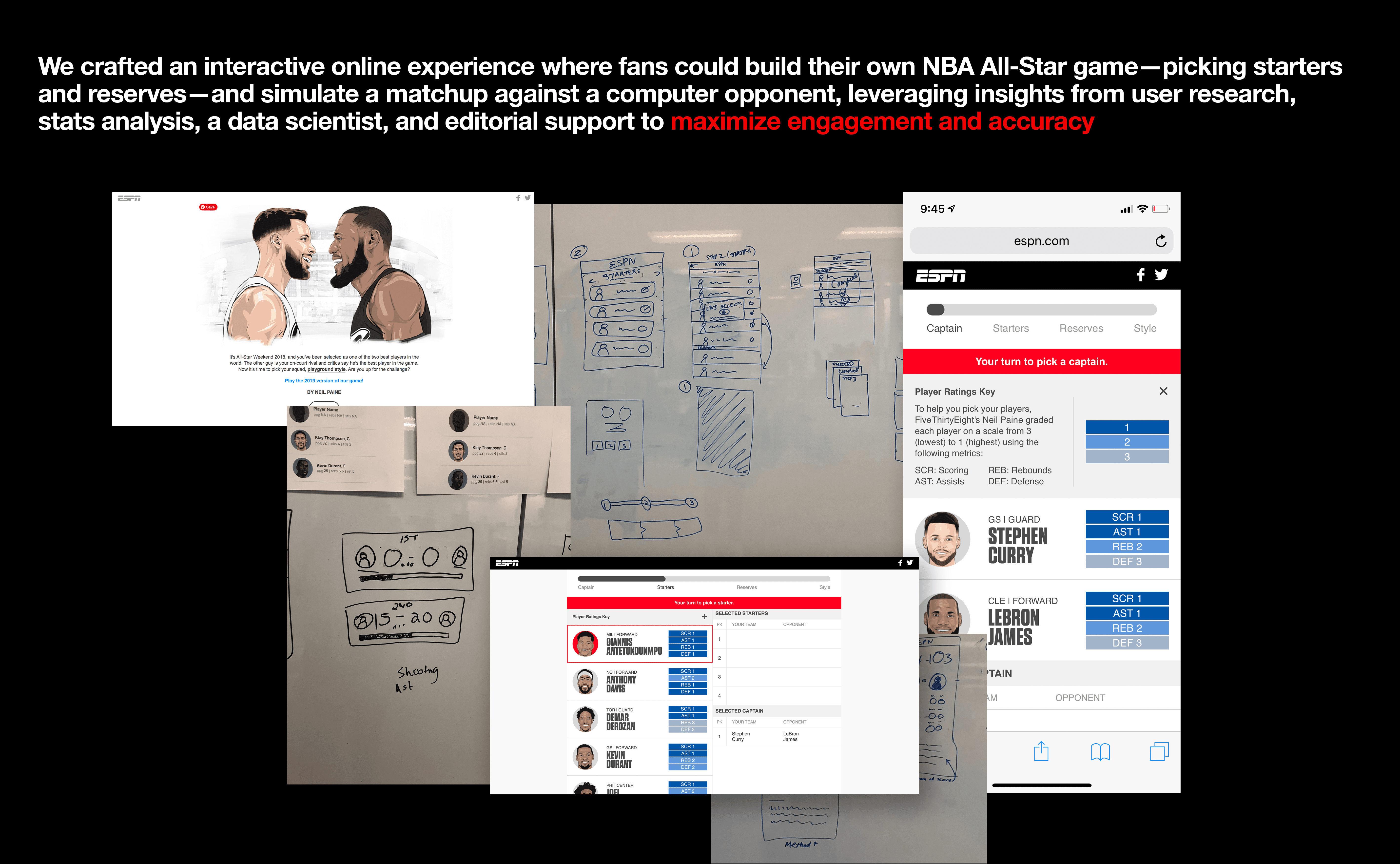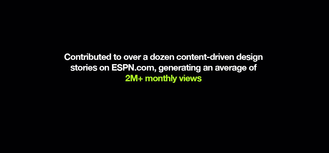 At ESPN each project was unique, but the goal remained the same: communicate a clear message to our users while expanding brand presence, building trust through our history and resources — including a world-class analytics team and a comprehensive sports statistics database — and keeping users engaged on our site and across social media platforms.