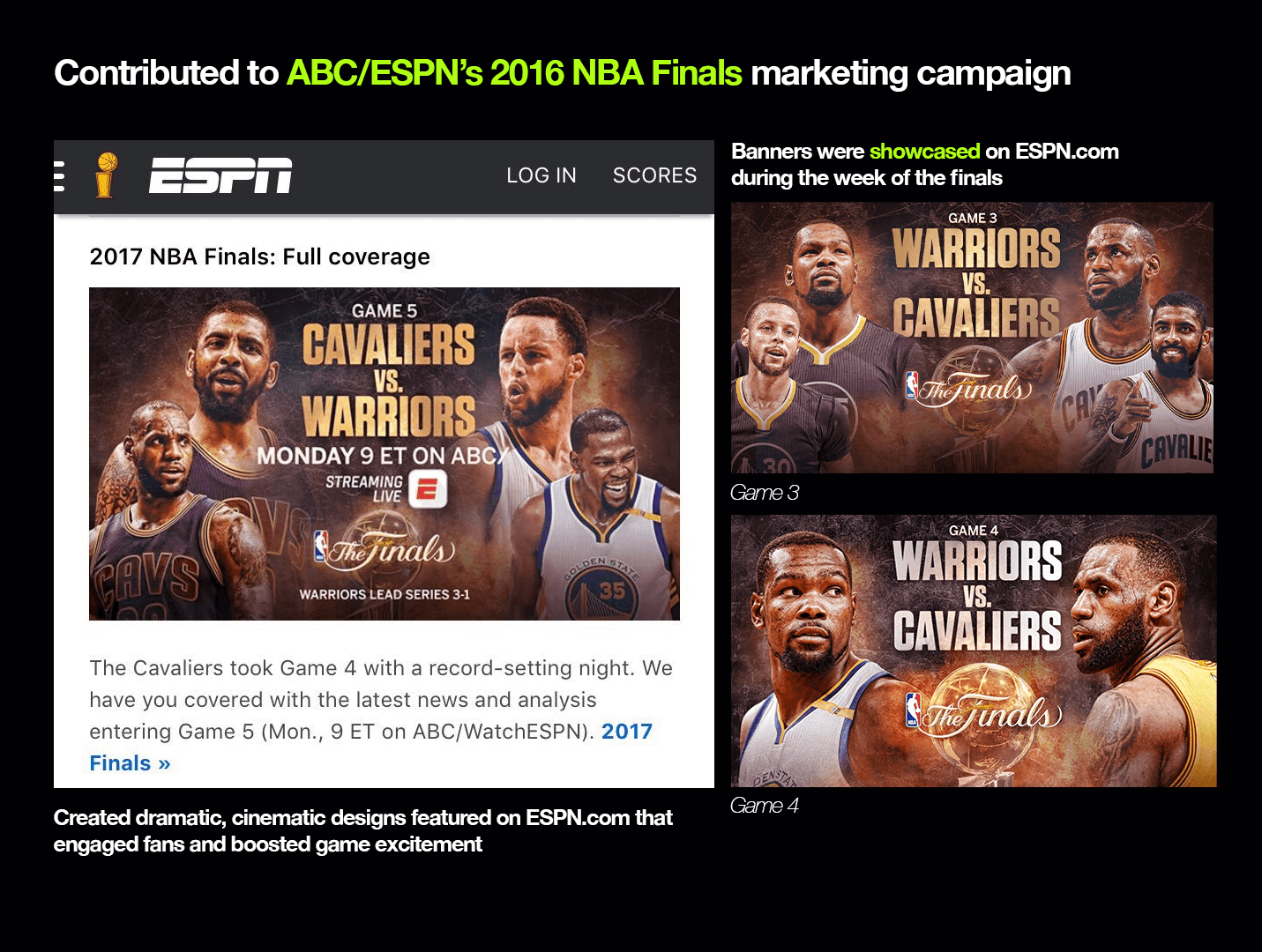 I worked on a wide range of projects, from high-profile campaigns like the LeBron Billboards — a custom content initiative where our team hired 32 NBA fans and artists to create billboards pitching LeBron to join their teams during free agency, before he ultimately joined the Lakers — to fast-turnaround design projects like custom jersey swaps during NBA free agency. I also contributed to major marketing campaigns for the NBA Finals, where the Golden State Warriors faced LeBron and the Cleveland Cavaliers, with content showcased across ESPN and ABC television platforms, a significant event for the company. The LeBron Billboards project strengthened my management and art direction skills, as I helped lead it from start to finish, while the jersey swap and NBA Finals campaigns allowed me to showcase my design skills under tight deadlines and high stakes.