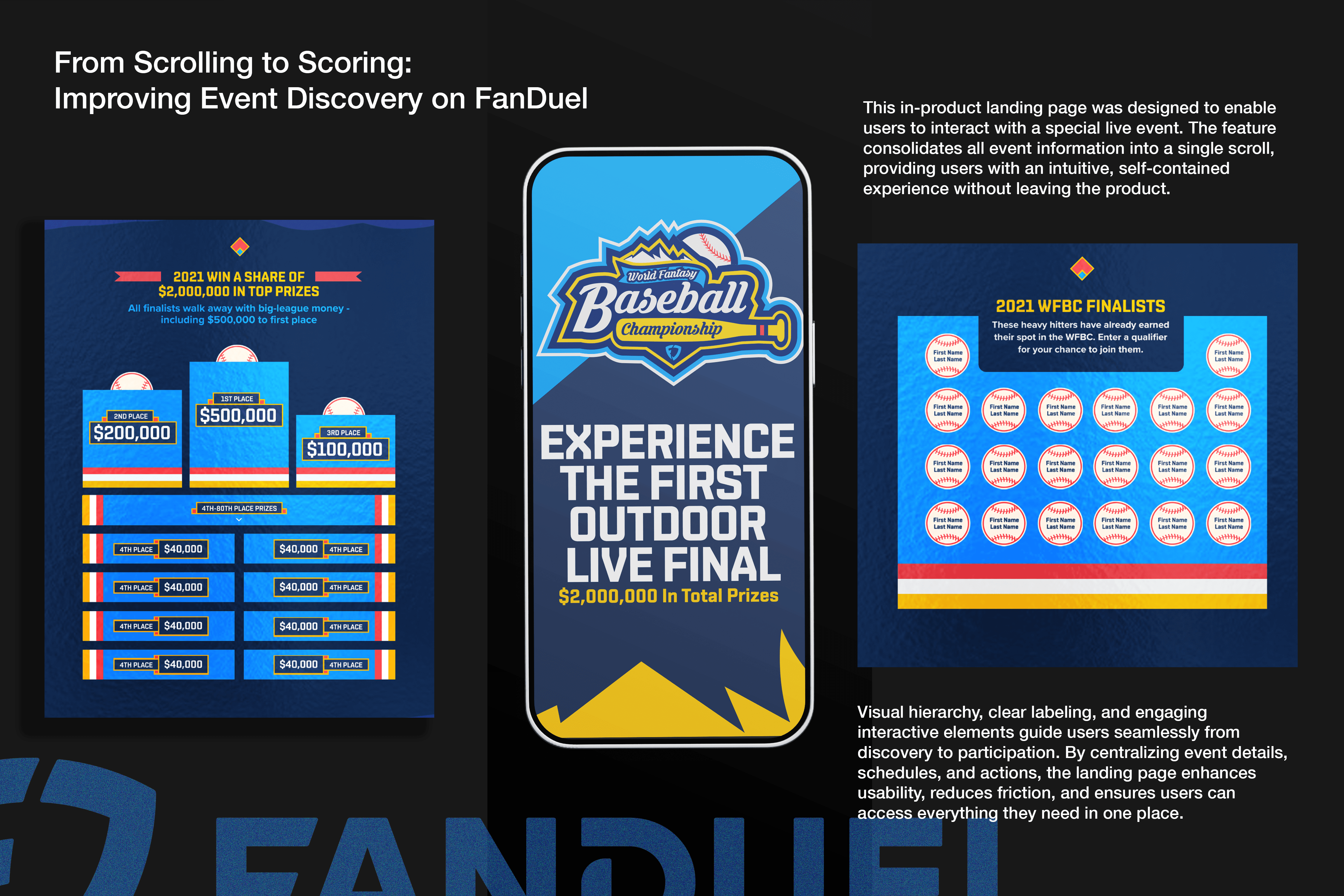 Impact: Increased user engagement and participation in promotions and live events. 25% growth in new users for the FanDuel x NFL campaign. Delivered consistent, high-quality visual and UX systems adopted across campaigns and product features. Improved cross-team collaboration and efficiency through standardized design frameworks.