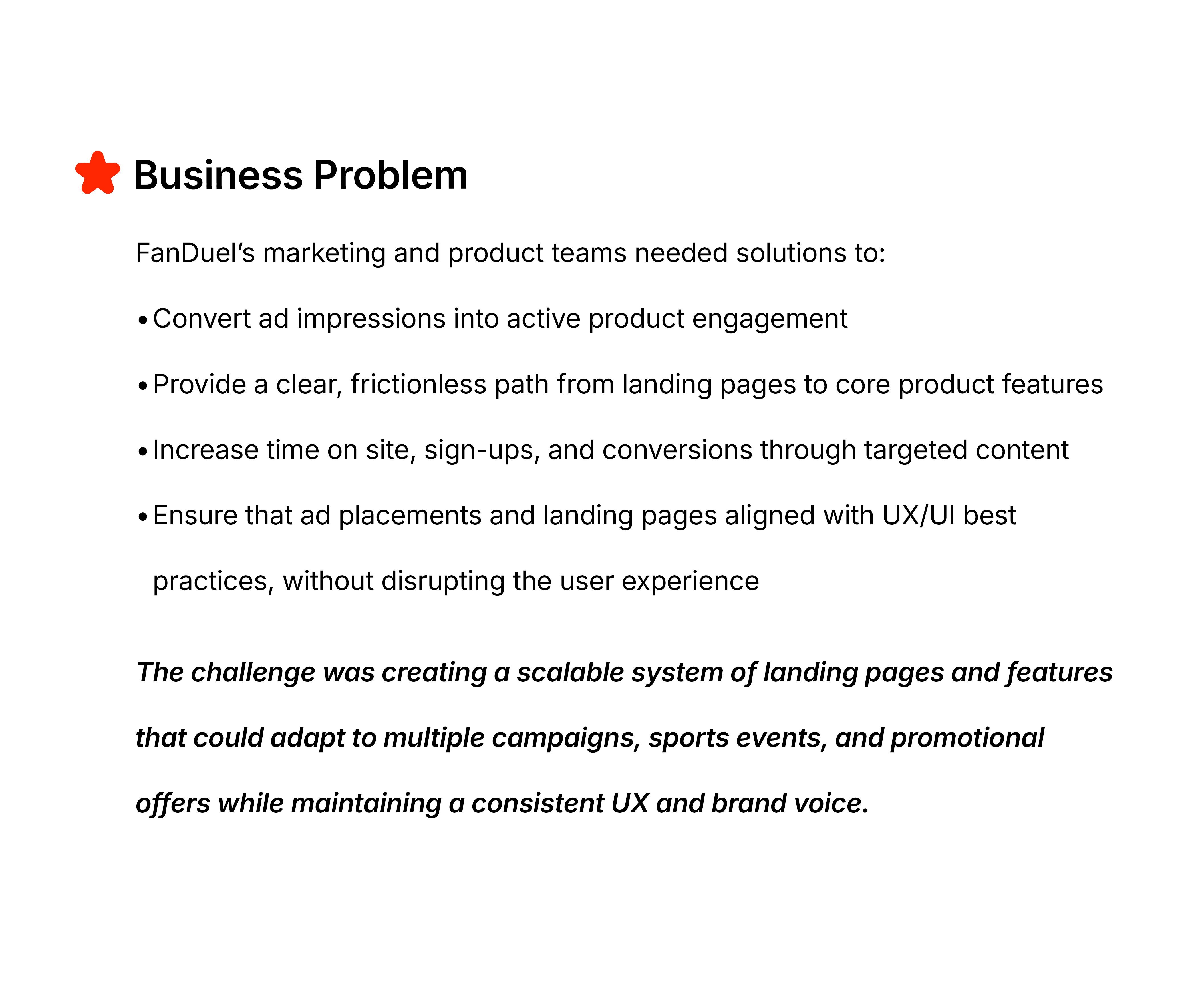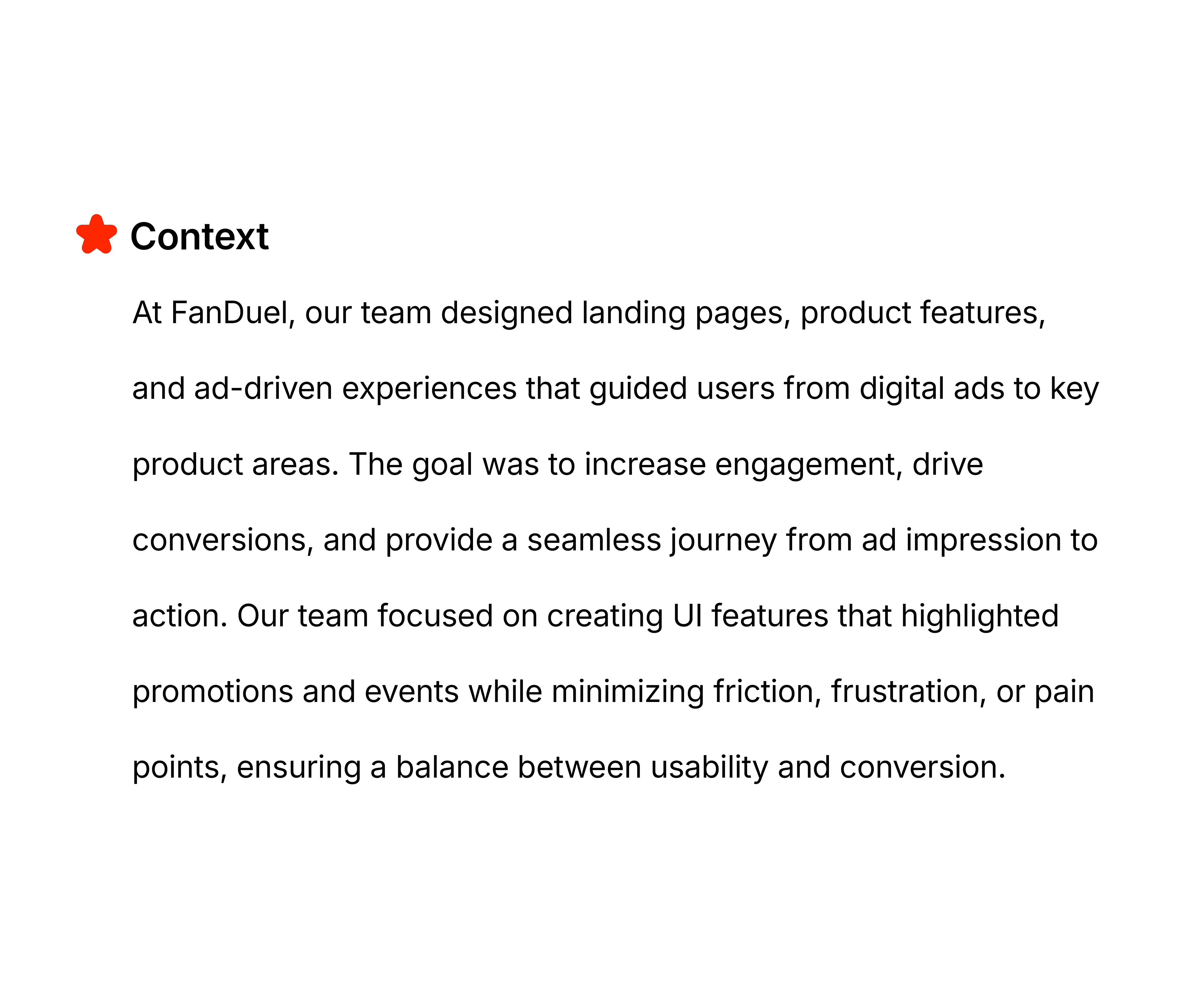 At FanDuel, our product strategy focused on converting fans into long-term users by creating a seamless path from fantasy sports engagement to sportsbook adoption as gambling became legal in more states. We designed landing pages, product features, and ad-driven experiences that reinforced FanDuel’s brand identity, built user trust, and prioritized usability at every touchpoint. By integrating interactive UI features, clear calls-to-action, and personalized promotions, we helped users transition naturally between products while maximizing engagement, retention, and conversion. This strategic approach ensured that our digital experiences not only captured attention but drove measurable business outcomes while maintaining a cohesive, reliable, and user-centered experience.