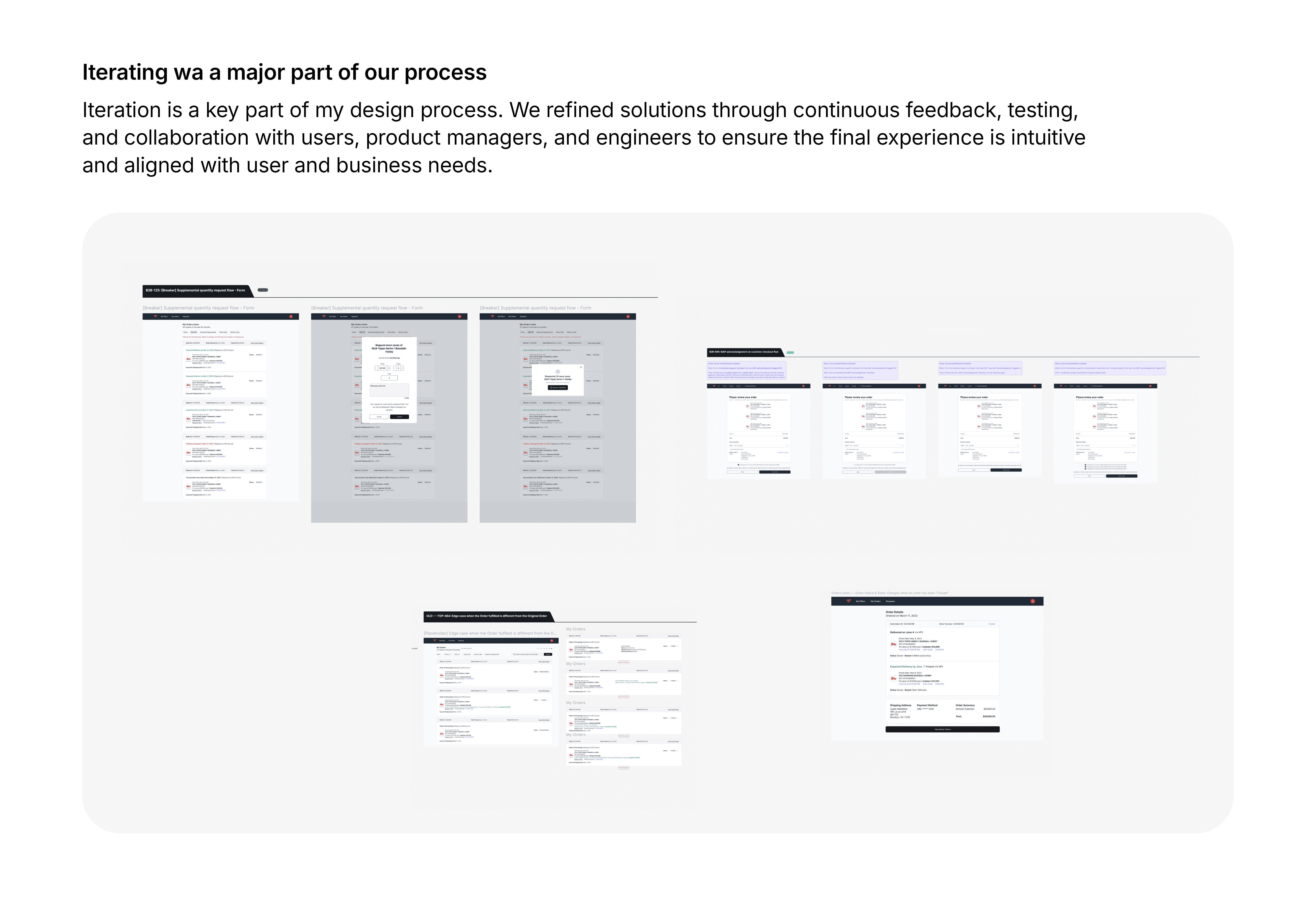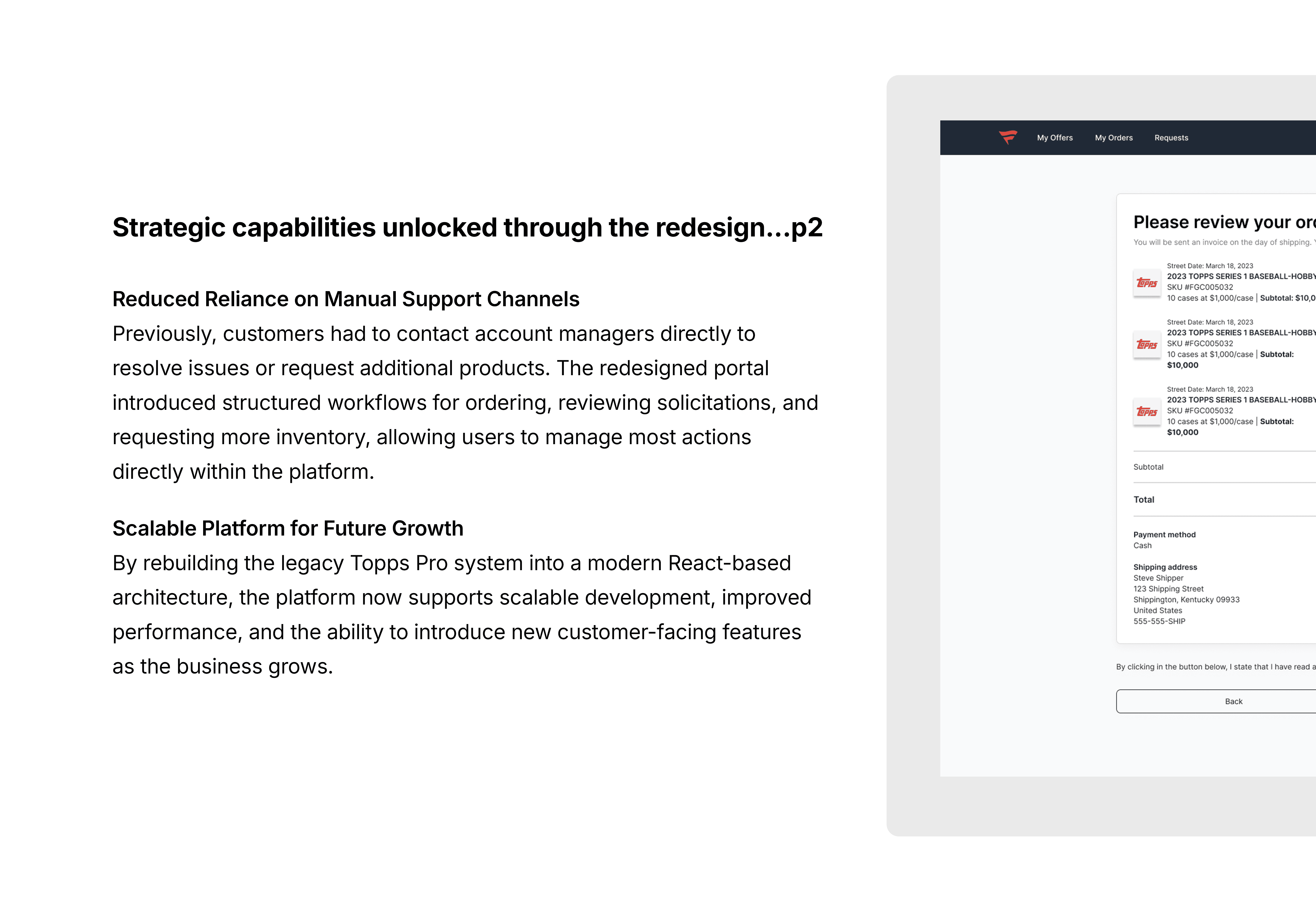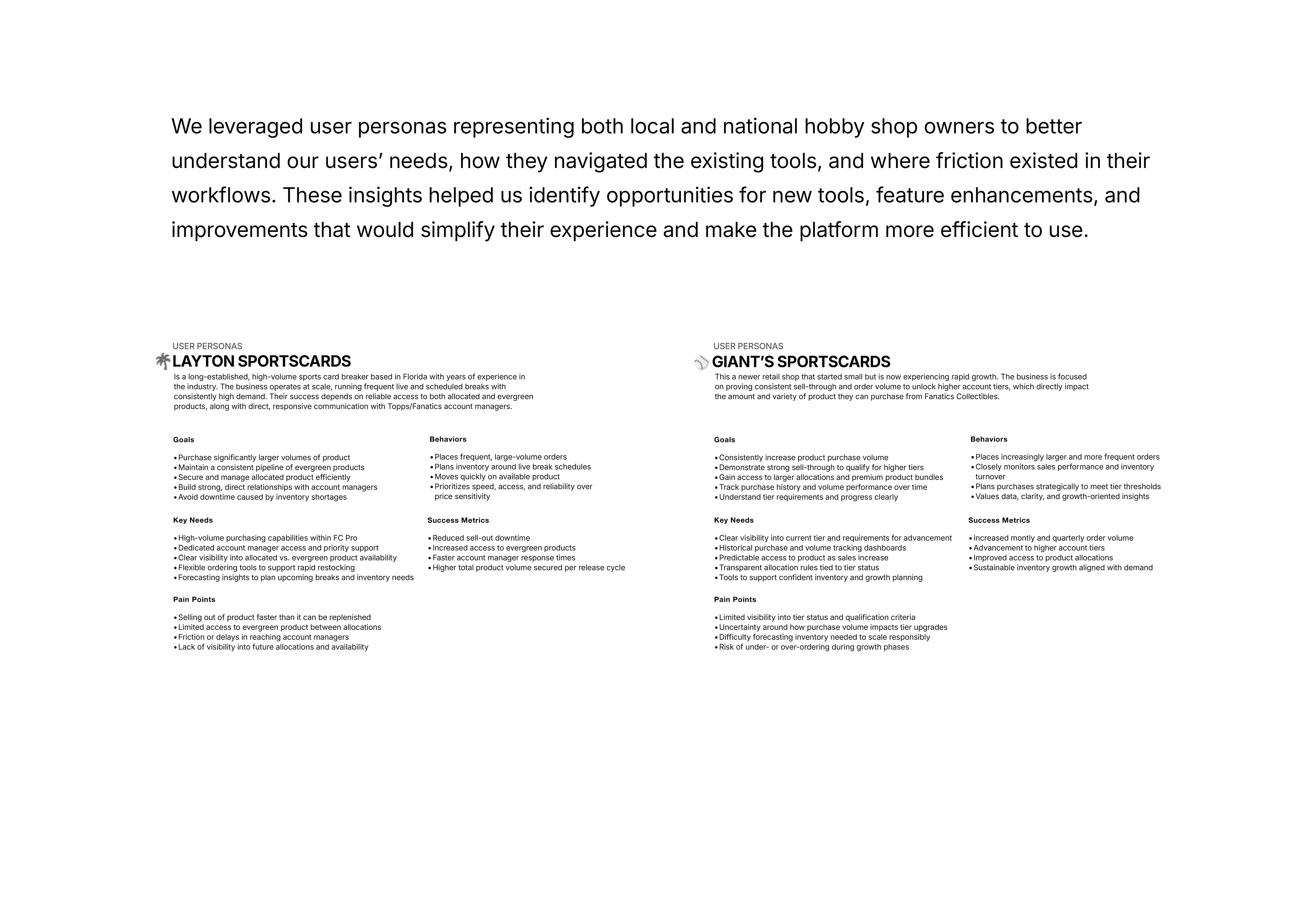 Fanatics Collectibles acquired Topps and inherited several legacy platforms, including Topps Pro, a B2B portal used by hobby shops and distributors to purchase trading card products. Through user feedback and internal analysis, we learned that the existing platform was difficult to navigate and lacked key functionality needed for customers to effectively manage their purchases. Users struggled to browse products, place orders, and track shipments, and the portal did not provide a way for customers to contact account managers directly.