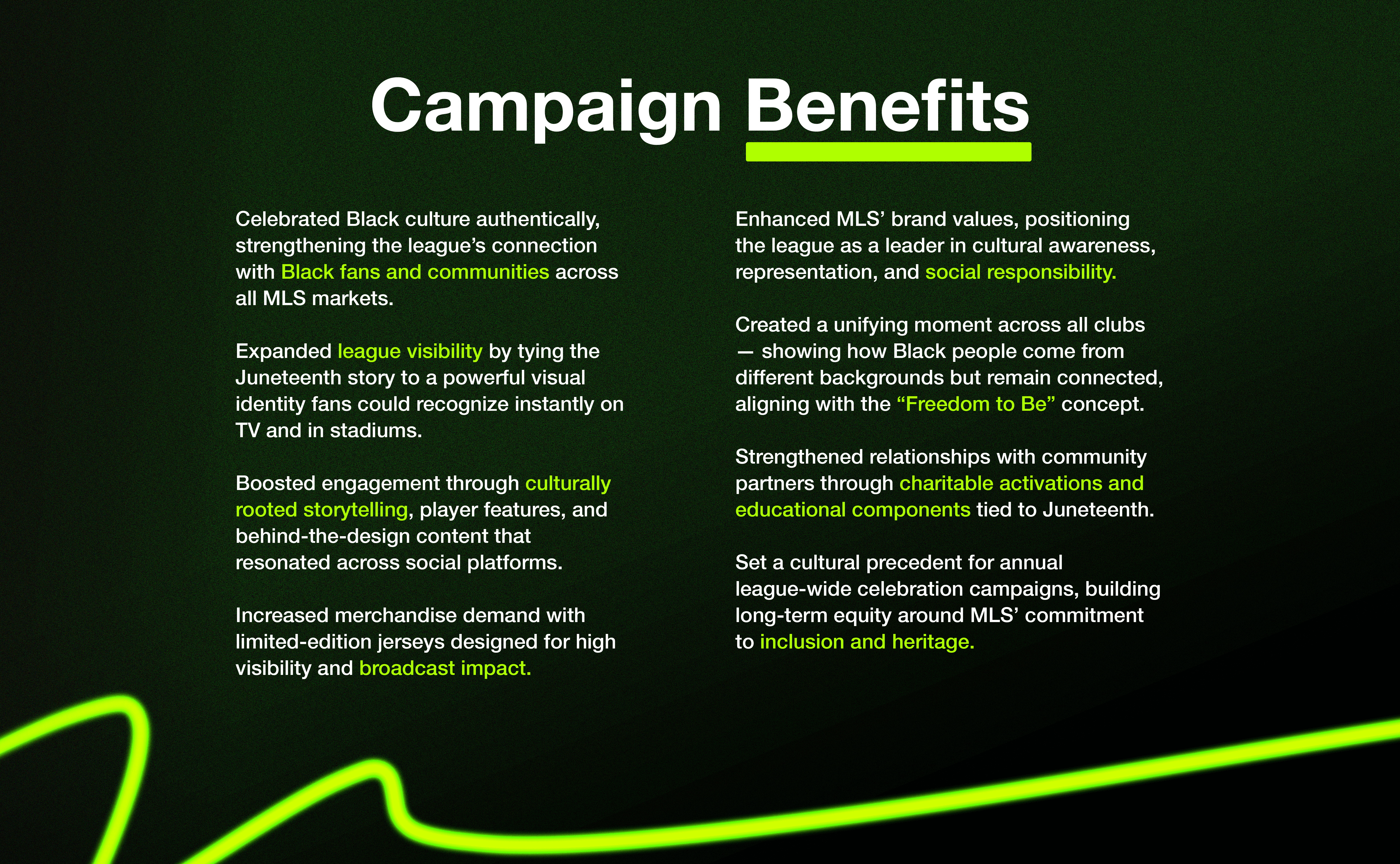 The final campaign resulted in a cohesive league-wide story that connected all 28 MLS clubs around a shared celebration of Black freedom, creativity, and community. The “Freedom To Be” identity became more than a visual—it became a statement that honored the past while amplifying the future of Black culture in sport.