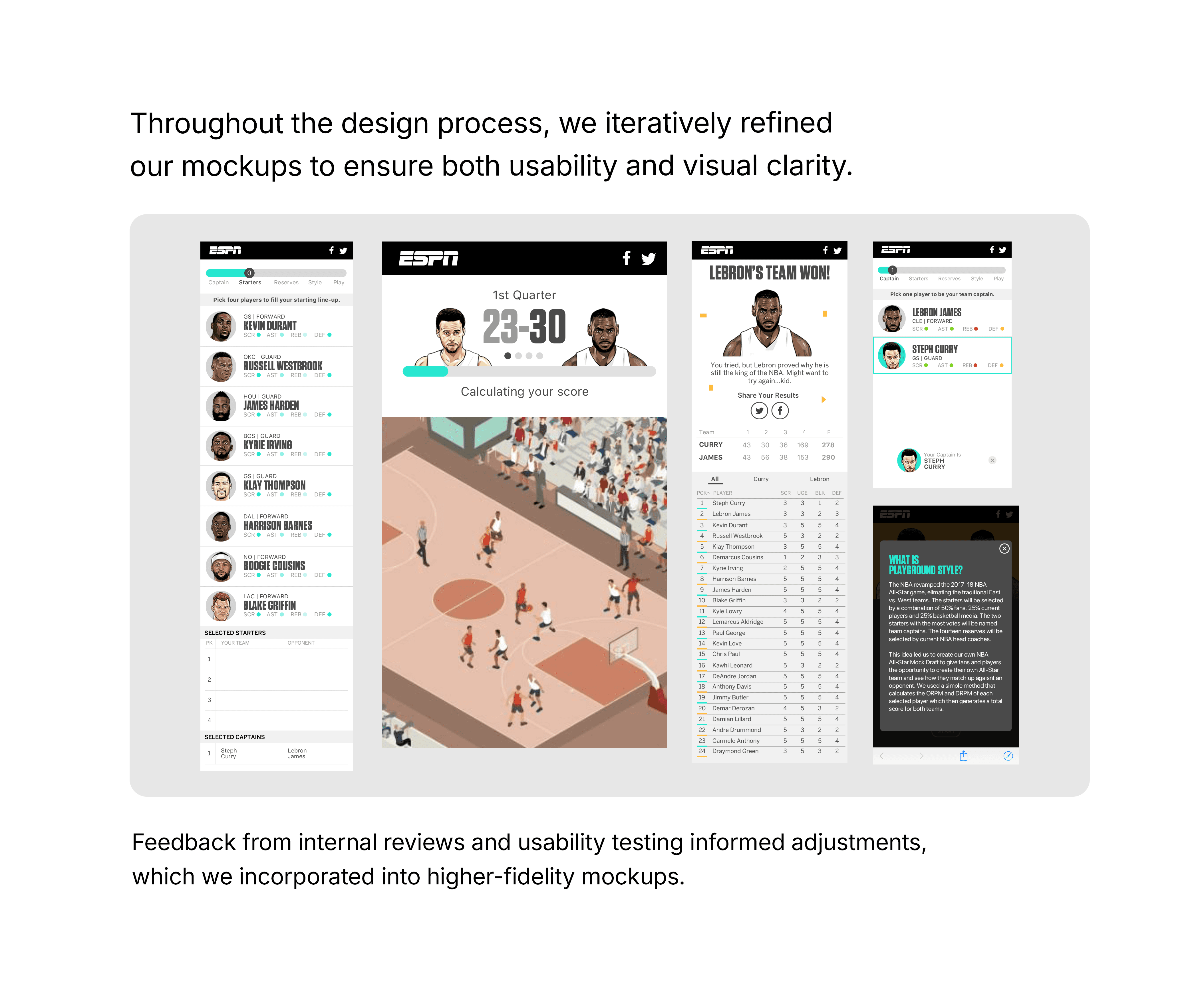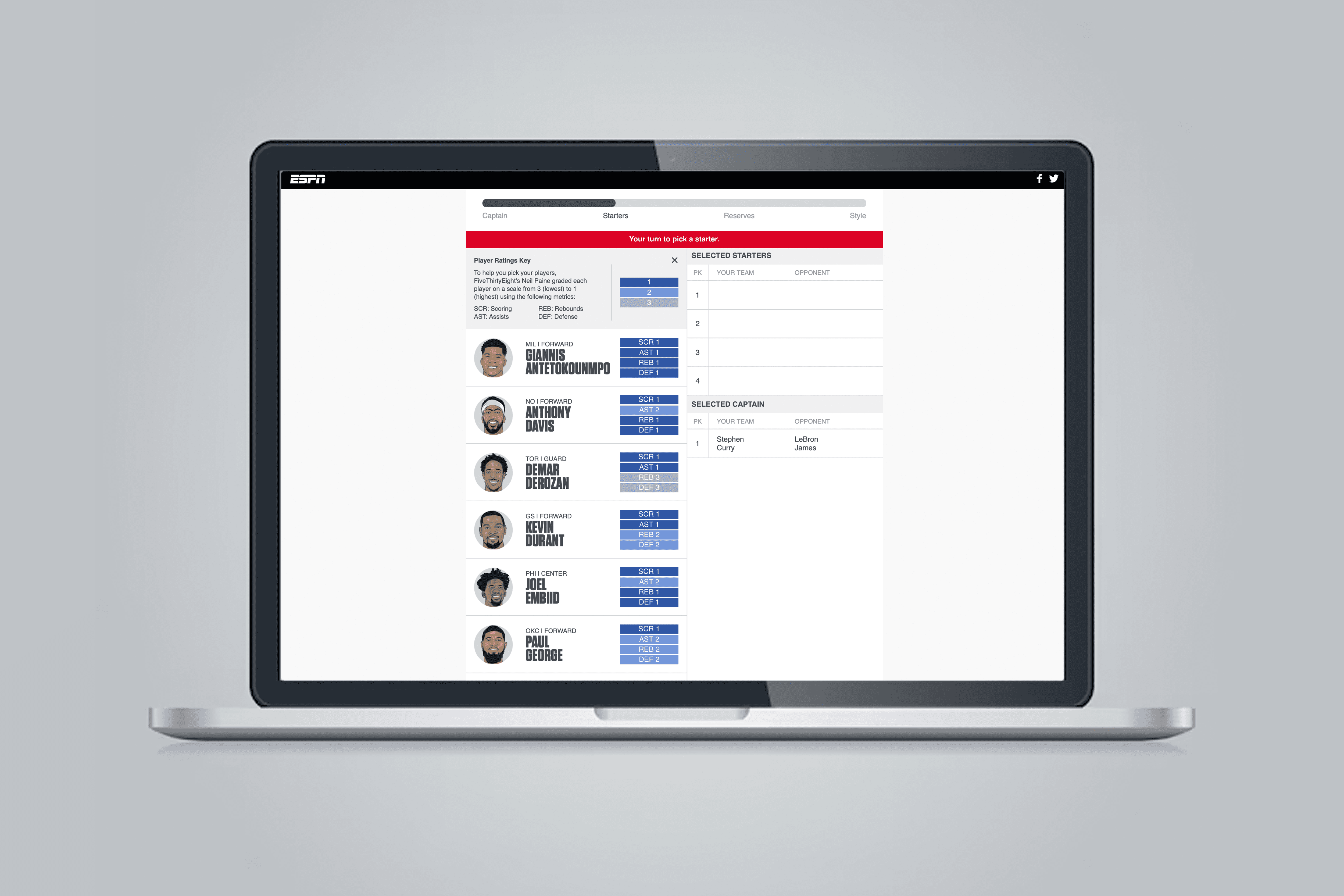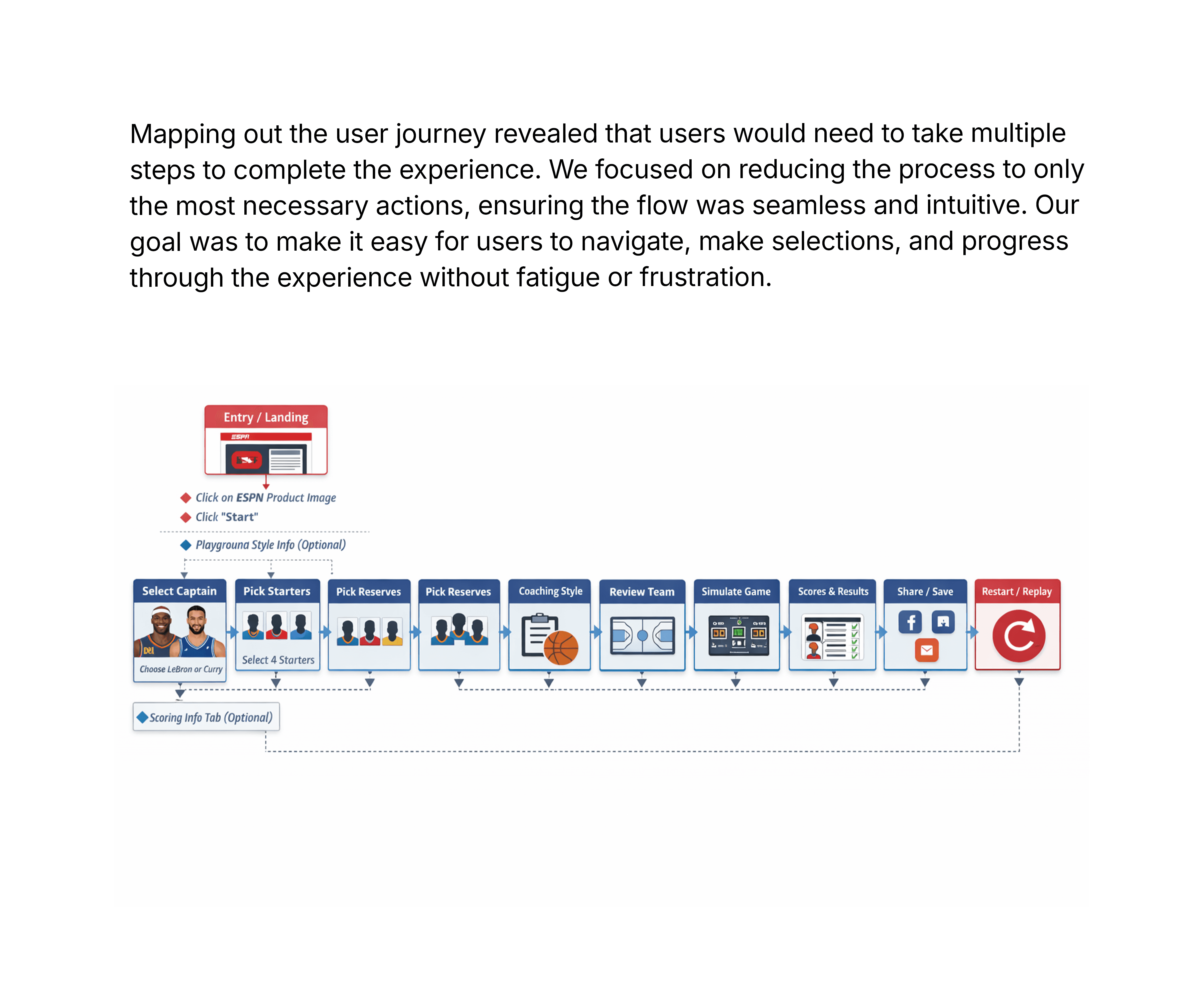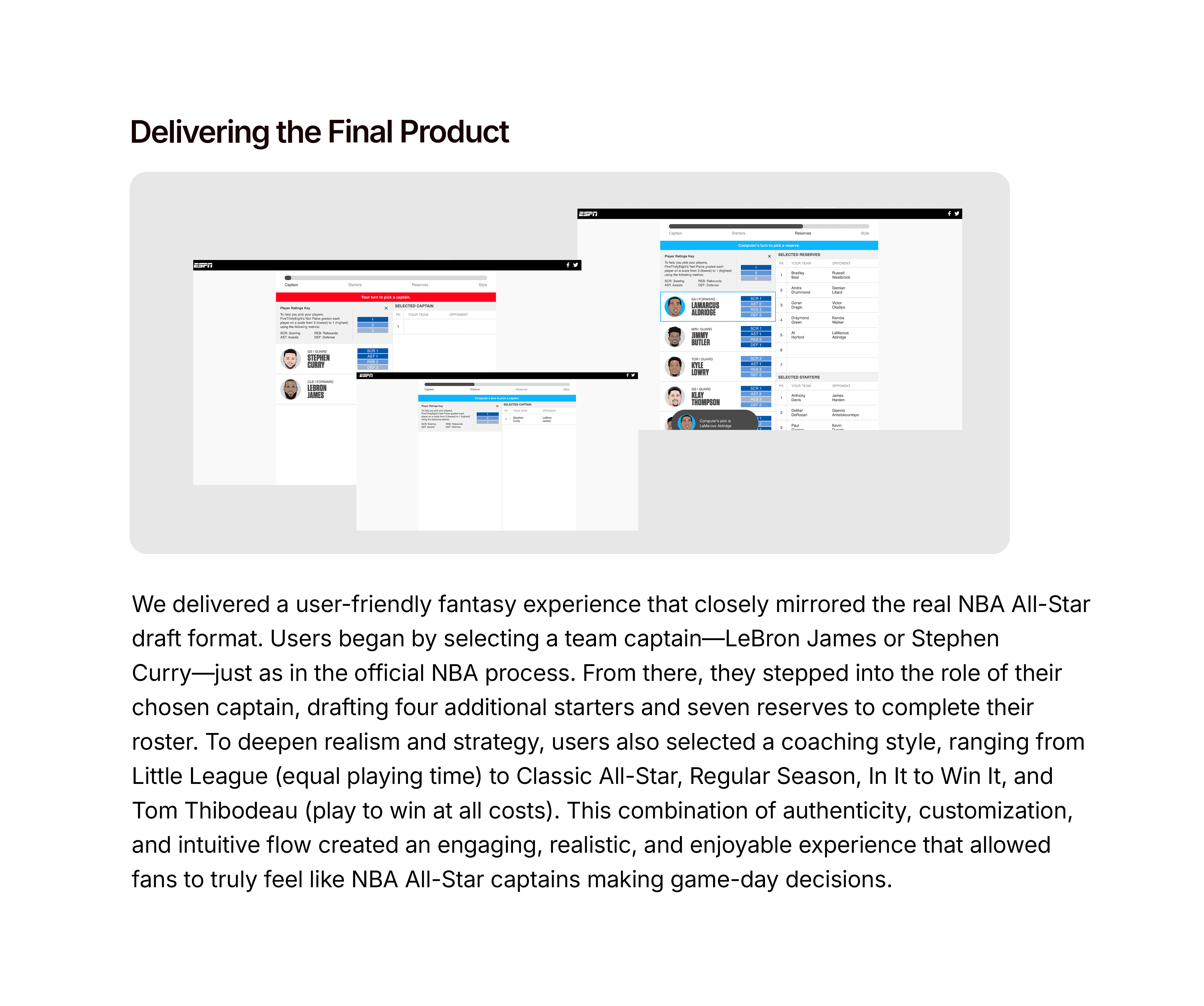 Our team was tasked with making this experience easy for users to navigate. We drew inspiration from ESPN Fantasy apps, NBA 2K, and other game-based experiences to create an interface that felt competitive, immersive, and intuitive. The goal was to give users the feeling of being an NBA All-Star captain; strategically selecting a winning squad and experiencing the excitement of game-day decision making.