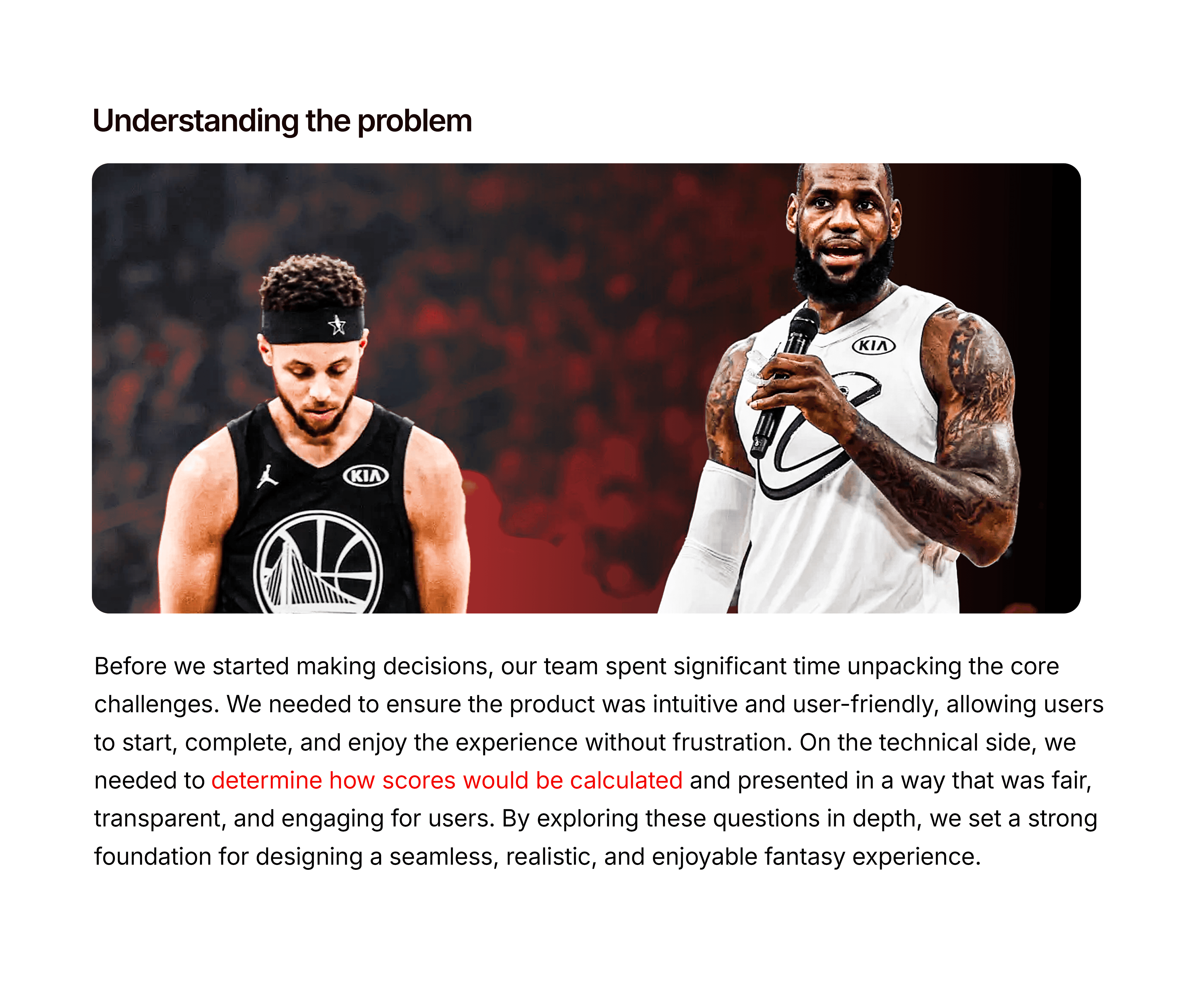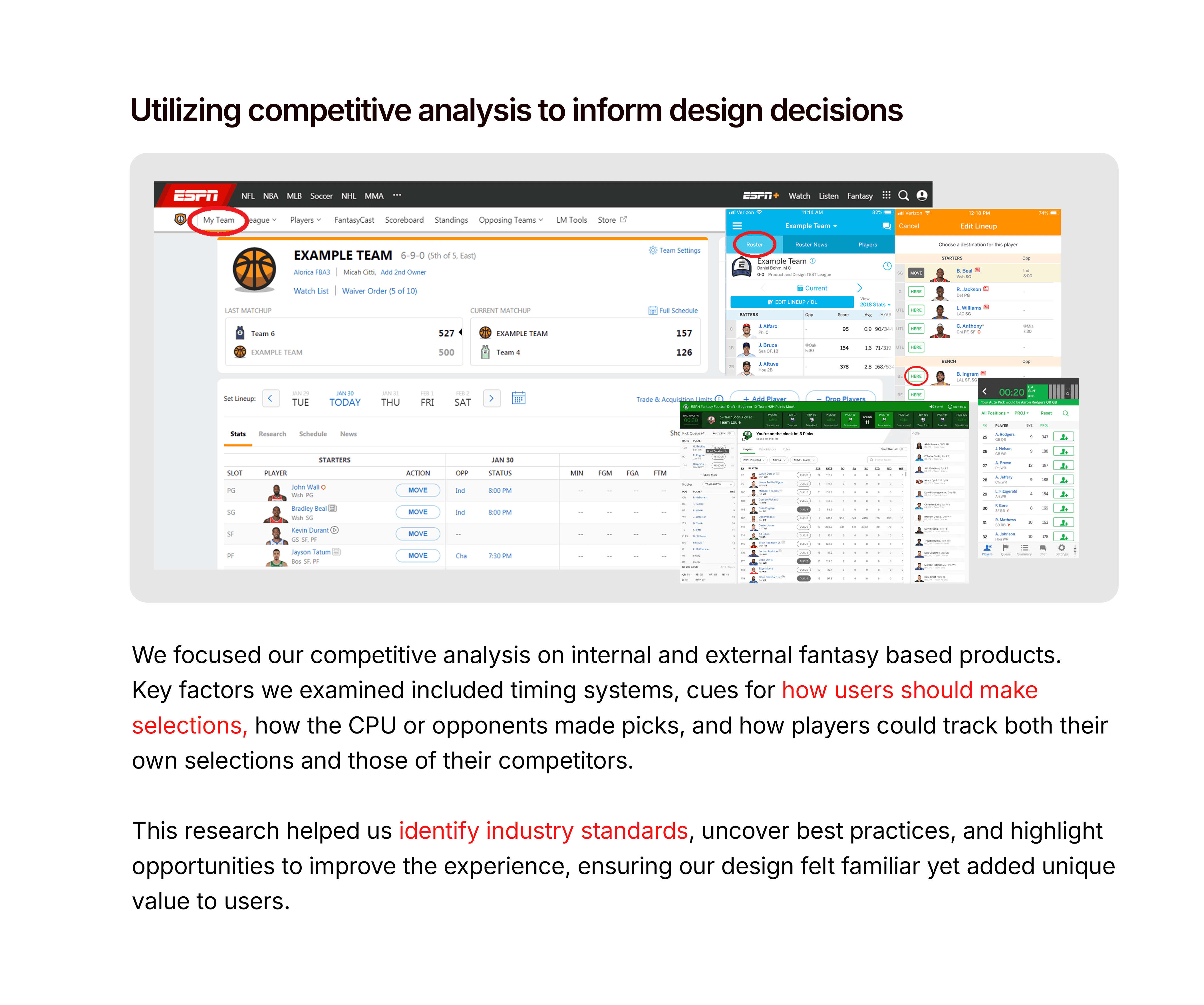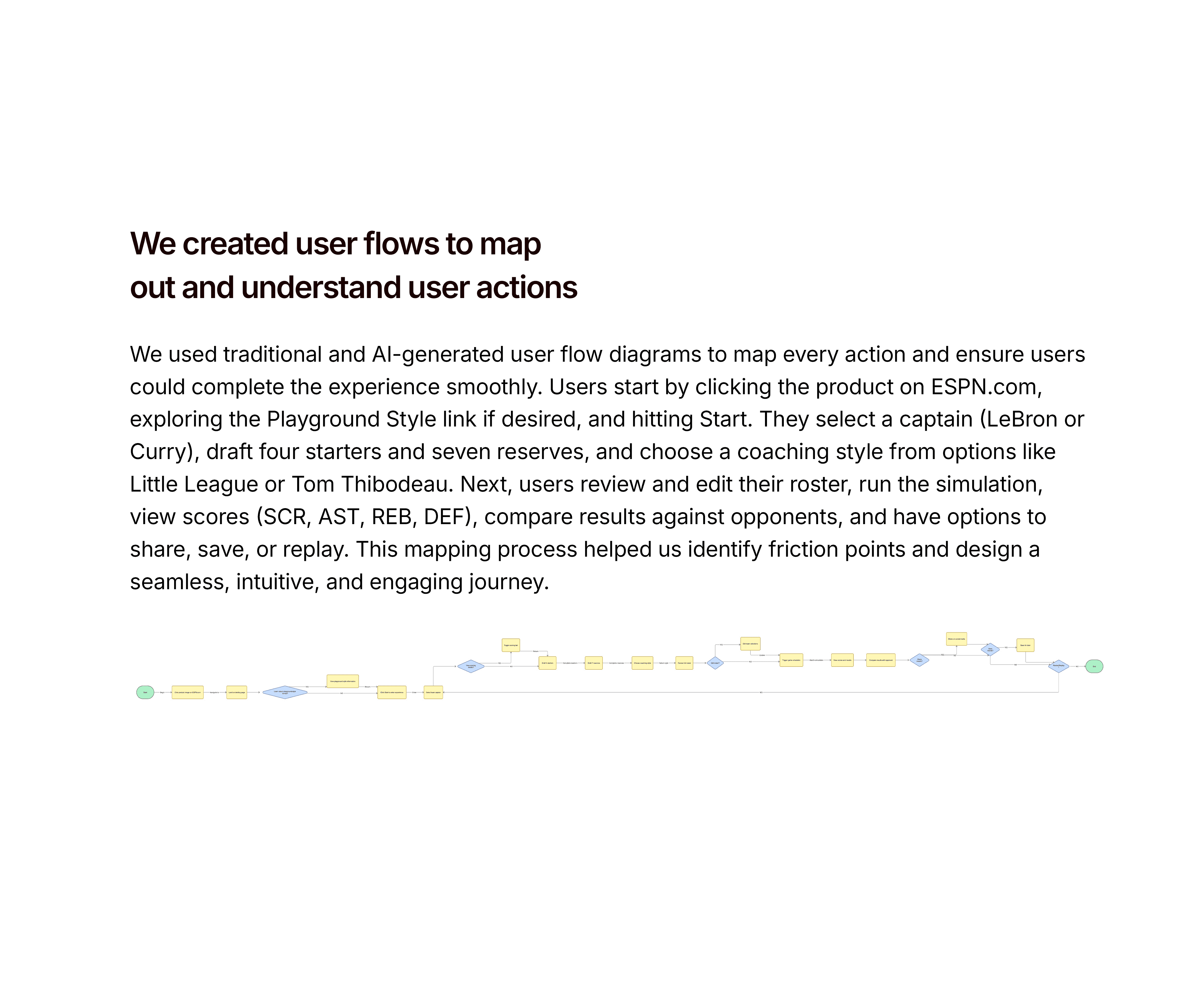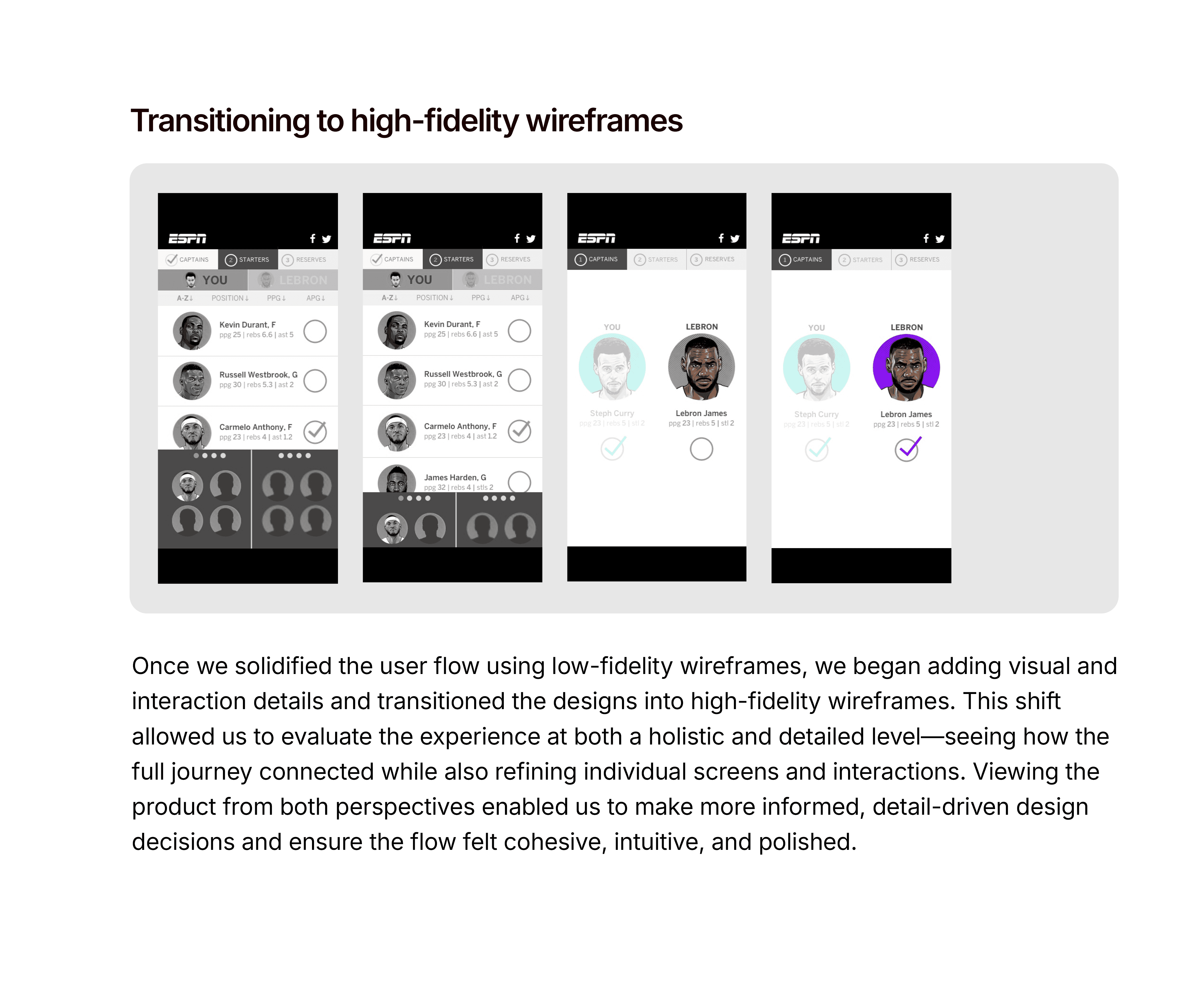 Our team was tasked with making this experience easy for users to navigate. We drew inspiration from ESPN Fantasy apps, NBA 2K, and other game-based experiences to create an interface that felt competitive, immersive, and intuitive. The goal was to give users the feeling of being an NBA All-Star captain; strategically selecting a winning squad and experiencing the excitement of game-day decision making.