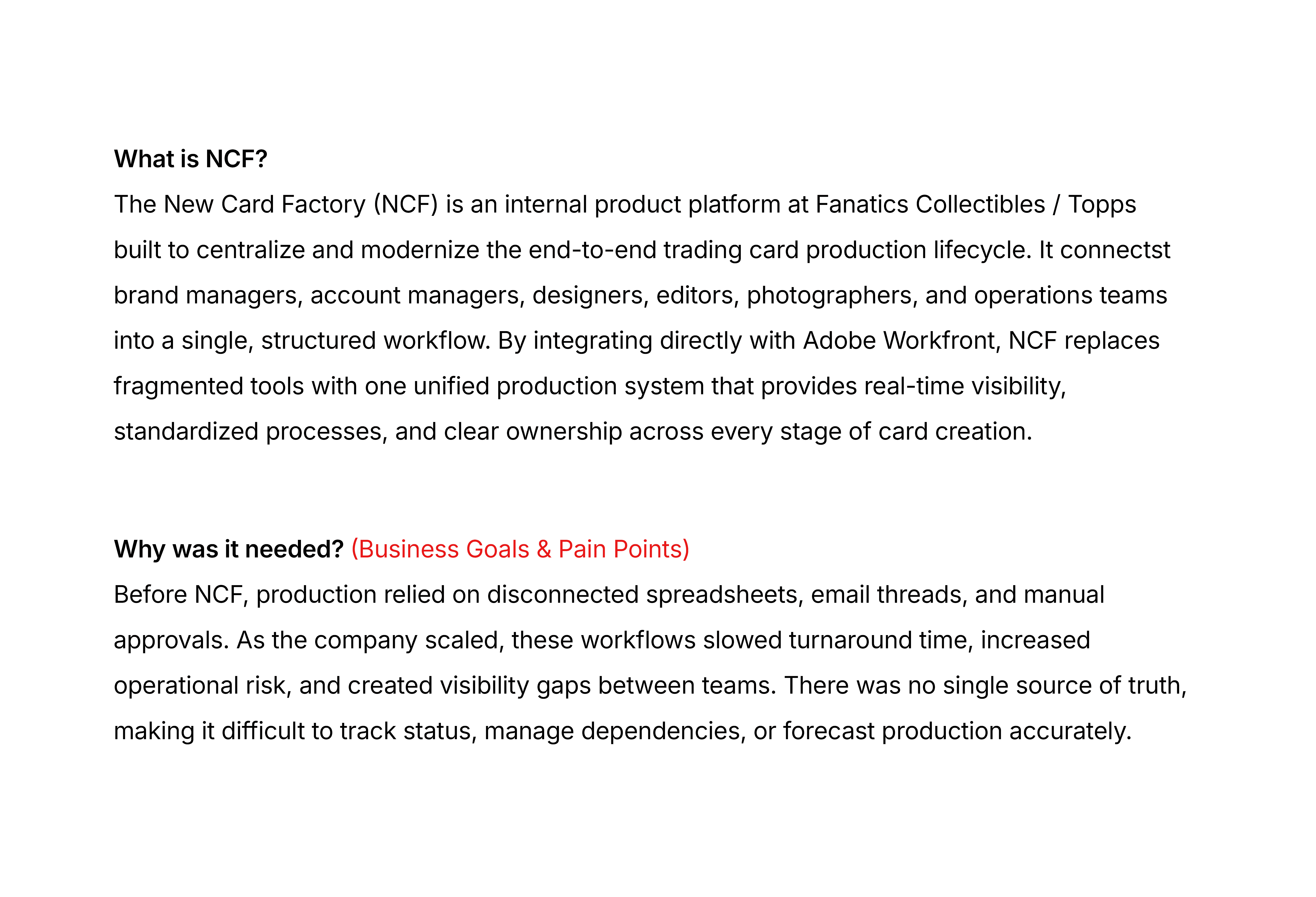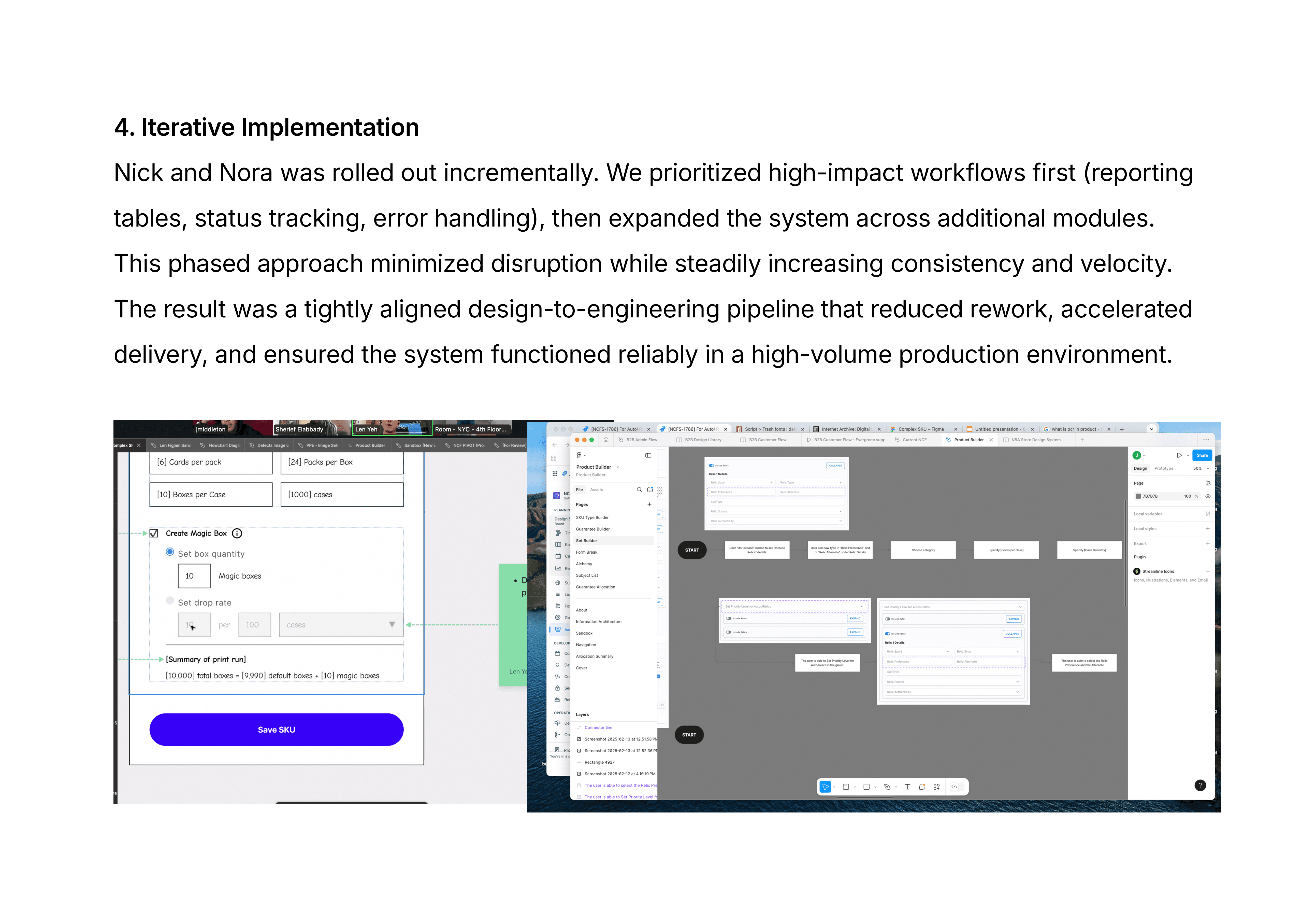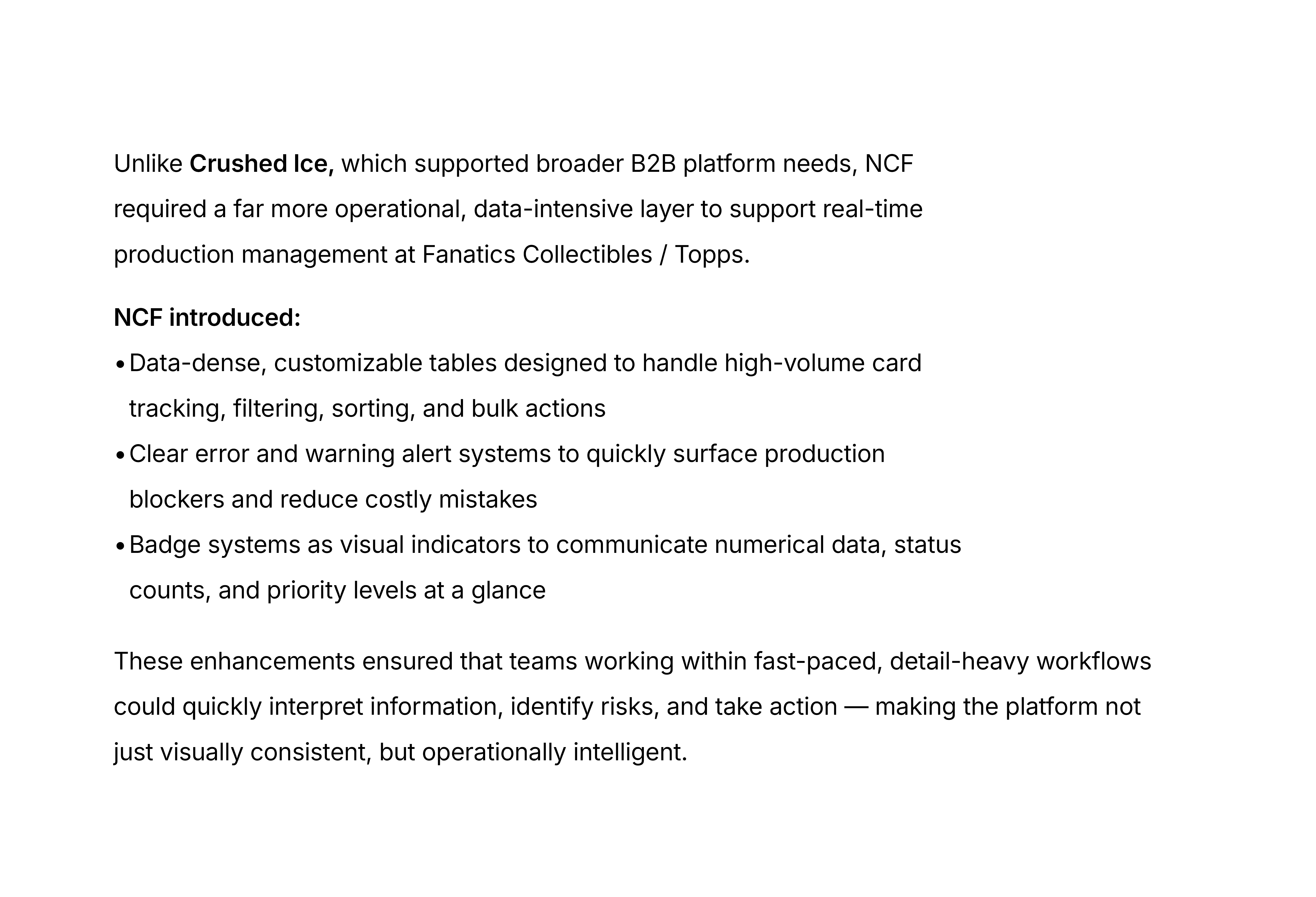 Nick and Nora ultimately transformed NCF from a collection of features into a scalable, production-grade platform. By aligning design, engineering, and QA around a shared system foundation, we reduced ambiguity, accelerated development cycles, and strengthened operational reliability. The system didn’t just standardize UI — it created a durable infrastructure that supported business growth, increased production velocity, and positioned NCF as a long-term strategic asset within Fanatics Collectibles / Topps.